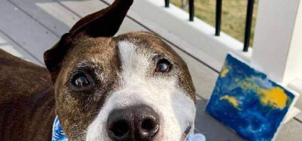 9 de janeiro de 2023Uma mistura de pitbull com boxer foi resgatado após uma briga ilegal e perdeu uma orelha; aprendeu a pintar e ganhou nova família