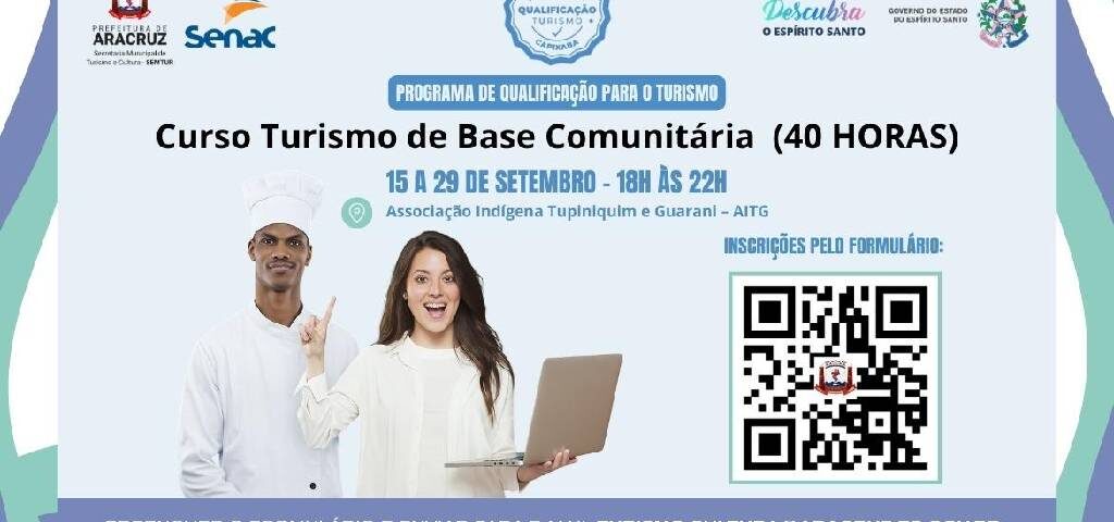 Com foco na qualificação, a Secretaria de Turismo e Cultura (Semtur) vem ampliando as oportunidades por meio de cursos profissionalizantes. Em parceria com o Governo do Estado e o Serviço Nacional de Aprendizagem Comercial (Senac), a Semtur lança o curso Turismo de Base Comunitária, que será realizado de 15 a 26 de setembro, na Associação Indígena Tupiniquim e Guarani (AITG), localizada na Aldeia Caieiras Velha, em Aracruz.