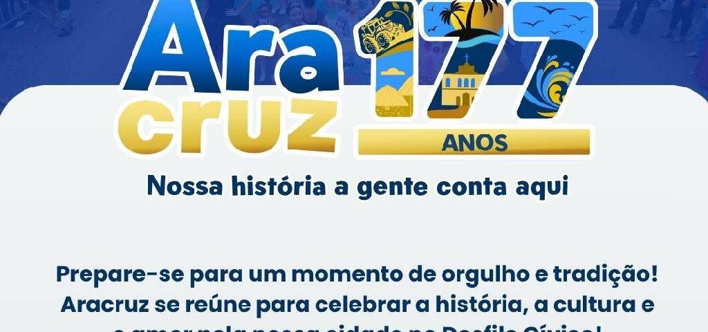 4 de abril de 2025Em grande estilo, Aracruz comemora seus 177 anos com um Desfile Cívico repleto de emoção e história! Nosso Desfile Cívico vai contar com a presença da Marinha, do Exército, Tiro de Guerra, Ex-combatentes, Bandas Marciais e muitos outros. Uma celebração da coragem e da união de nossa gente!