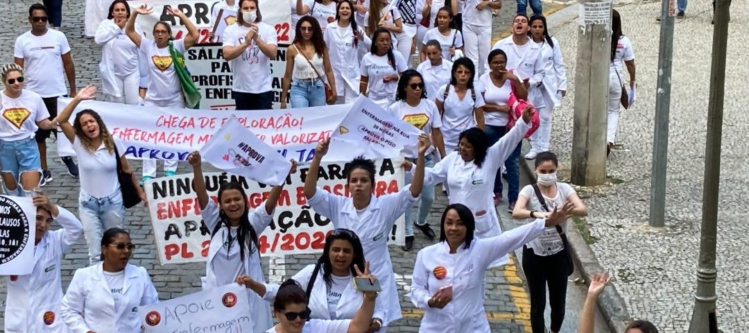 No Dia Mundial da Saúde, nesta quinta-feira (7), a categoria da enfermagem foi às ruas em todo o país pela aprovação do Projeto de Lei (PL) 2564, que estabelece um piso salarial para os trabalhadores. Além disso, também foi pautado o prosseguimento da luta pela carga horária de 30h semanais. Em Vitória, a manifestação teve concentração na praça Costa Pereira, no Centro da Capital, de onde seguiu para o Palácio Anchieta, sede do governo do Estado.