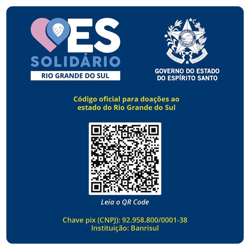 O Governo do Estado também reativou o ES Solidário. As doações em dinheiro podem ser realizadas via Pix, que serão direcionadas diretamente para a conta do Governo do Rio Grande do Sul. A conta SOS Rio Grande do Sul está recebendo doações por meio do CNPJ: 92.958.800/0001-38