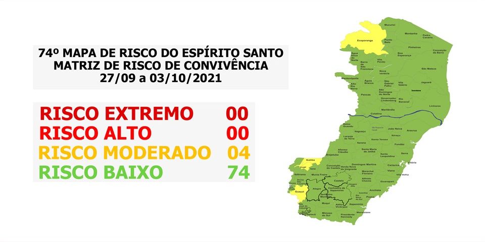 O Governo do Estado anunciou, nesta sexta-feira (24), o 74º Mapa de Risco Covid-19, que terá vigência desta segunda-feira (27) até o próximo domingo (03). Dos 78 municípios capixabas, 74 estão classificados em Risco Baixo e somente quatro (Ecoporanga, Guaçuí, Ibatiba e Irupi) em Risco Moderado.