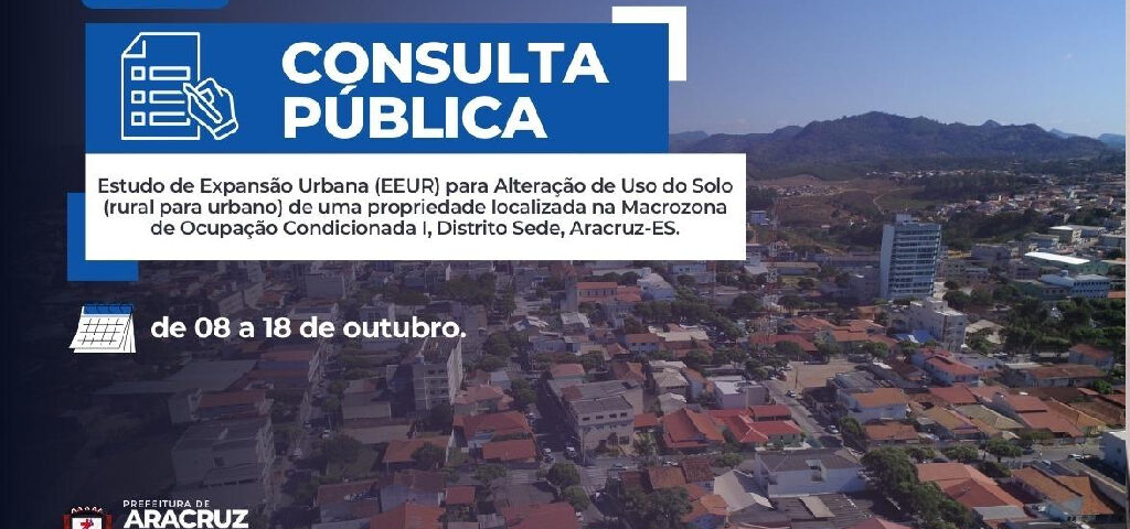 9 de outubro de 2024A Prefeitura Municipal de Aracruz, por meio da Secretaria de Desenvolvimento Urbano (Semdur), está convidando a população para participar da Consulta Pública sobre o Estudo de Expansão Urbana (EEUR). O estudo propõe a alteração do uso do solo de uma propriedade localizada na Macrozona de Ocupação Condicionada I, no Distrito da Sede, em Aracruz-ES, que atualmente é rural e passaria a ser urbano. O processo está registrado sob o número 16.373/2023 e tem como requerente a Conquista Gestão e Negócios Imobiliários LTDA.