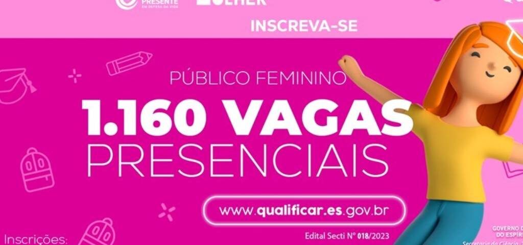 23 de agosto de 2023Estão abertas as inscrições para a 3ª oferta presencial do Programa Qualificar ES reservadas ao público feminino. As mulheres capixabas interessadas em realizar um dos cursos ofertados pelo Governo do Estado, por meio da Secretaria da Ciência, Tecnologia, Inovação e Educação Profissional (Secti), em parceria com o Programa Agenda Mulher, podem se inscrever a partir desta terça-feira (22).