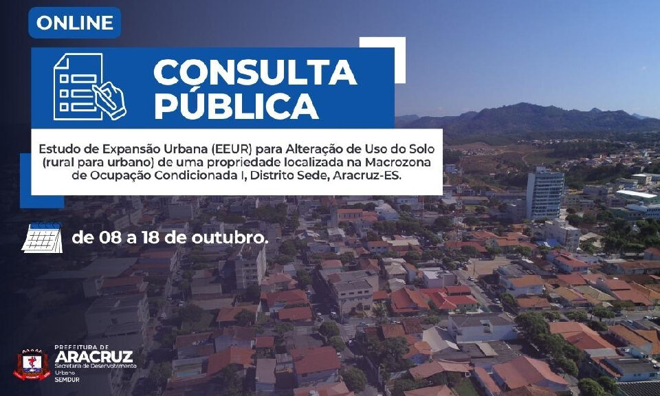 A Prefeitura de Aracruz, por meio da Secretaria de Desenvolvimento Urbano (Semdur), convoca a população para participar da Consulta Pública sobre o Estudo de Expansão Urbana (EEUR). O estudo visa alterar o uso do solo de uma área na Macrozona de Ocupação Condicionada I, no Distrito da Sede, de rural para urbano. O processo é registrado sob o número 16.373/2023 e é requerido pela Conquista Gestão e Negócios Imobiliários LTDA.