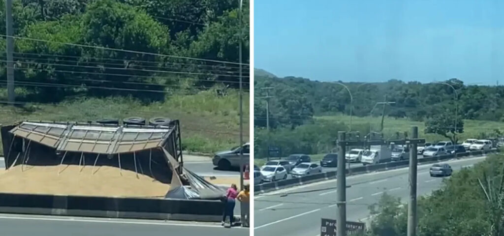 3 de fevereiro de 2025Um caminhão carregado de areia tombou na Rodovia do Sol, a altura do bairro Jockey de Itaparica, em Vila Velha, na manhã desta segunda-feira (03).